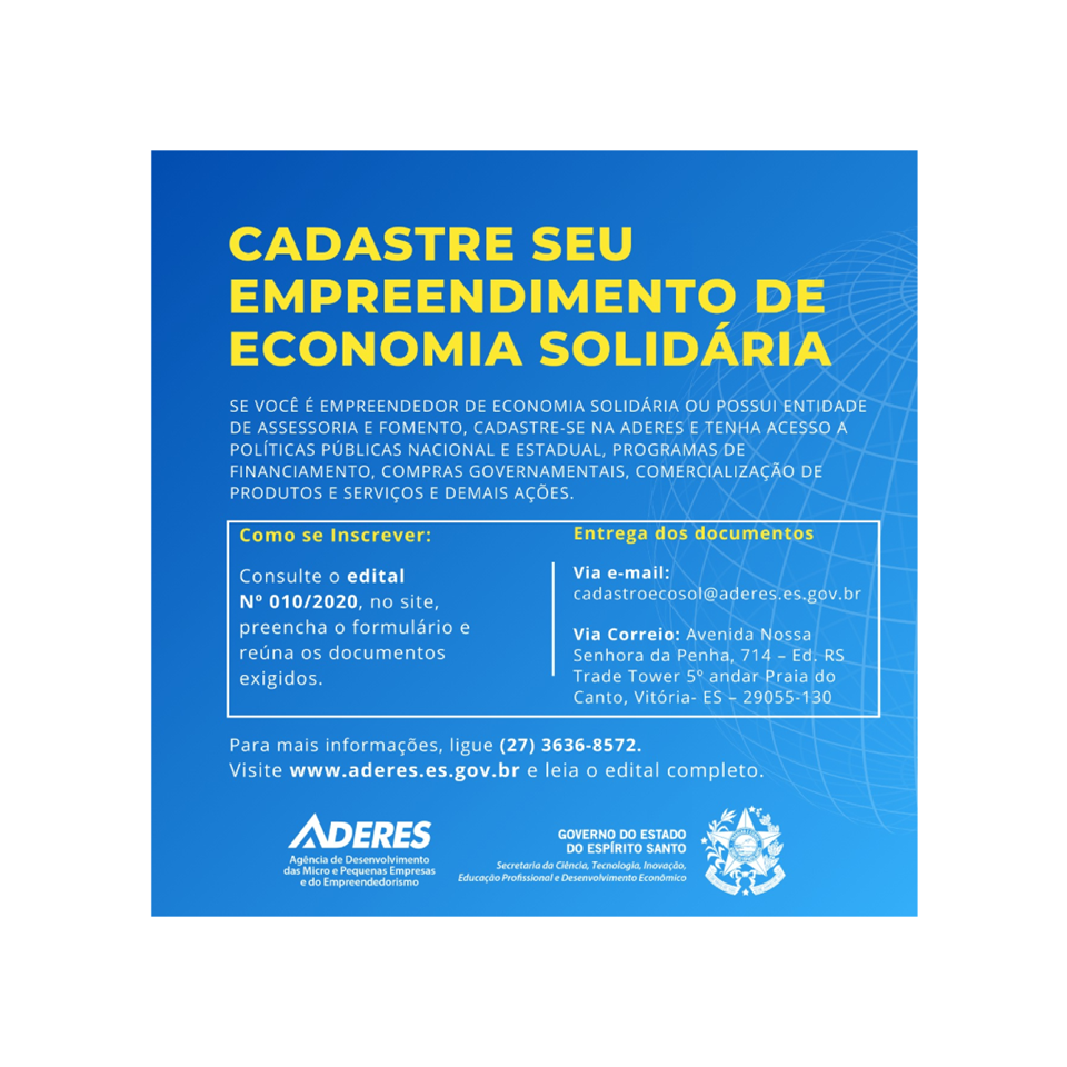 O Governo do Estado, por meio da Agência de Desenvolvimentos das Micro e Pequenas Empresas e do Empreendedorismo do Estado (Aderes), em conformidade com as diretrizes estabelecidas na Lei Estadual nº 8.256/2006, que Institui a Política Estadual de Fomento à Economia Solidária no Espírito Santo, abriu cadastro de registro para Empreendimentos de Economia Solidária (EES) e Empreendimentos de Assessoria e Fomento (EAF) da categoria.