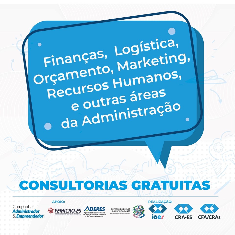 Donos de pequenos negócios vão receber consultoria gratuita nas áreas de Finanças, Orçamento, Logística, Recursos Humanos, Tecnologia Da Informação e outras áreas da Administração. A ação é realizada pela Agência de Desenvolvimento das Micro e Pequenas Empresas e do empreendedorismo do Estado (Aderes), Conselho Regional de Administração (CRA) e Federação das Associações de Micro e Pequenas Empresas e Empreendedores Individuais do Espírito Santo (Femicro).